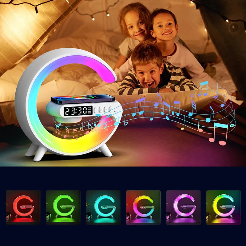 - Multifunktionalität: Kombiniert Nachttischlampe, Wecker, kabelloses Ladegerät und Bluetooth-Lautsprecher in einem eleganten Gerät.