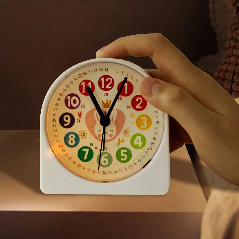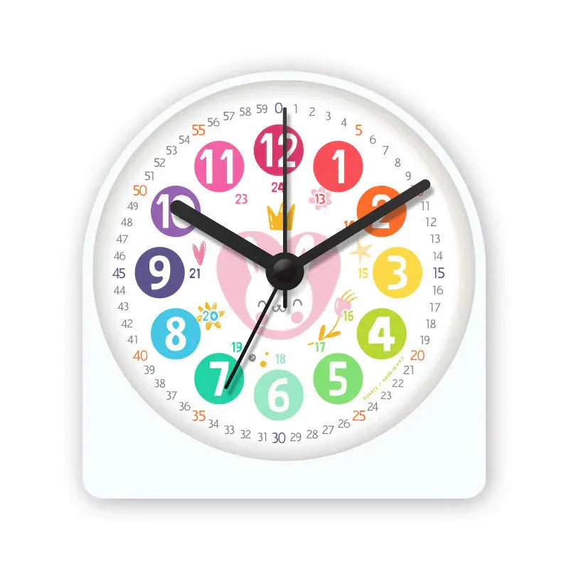 Unser Rosa Lernwecker für Mädchen mit Hase ist mehr als nur ein hübsches Gesicht. Er ist ein durchdachtes pädagogisches Werkzeug, das speziell auf die Bedürfnisse von Kindern zugeschnitten ist. Die großen, farbigen Stundenzahlen (1-12) sind sofort erkennbar, während die kleineren Minutenzahlen am äußeren Rand (0-59) den Kindern helfen, die Minuten präzise abzulesen. Sogar die 24-Stunden-Anzeige (13-24) ist diskret unter den Stunden integriert, um ein umfassendes Verständnis der Tageszeit zu fördern. Das zuckersüße Hasen-Design mit der kleinen Krone in der Mitte animiert die Kinder dazu, sich mit ihrer Uhr zu beschäftigen und ihre neue Fähigkeit stolz zu präsentieren. Geben Sie Ihrem Kind ein Gefühl von Unabhängigkeit und Selbstvertrauen mit diesem charmanten Wecker, der das Lernen zum Vergnügen macht und gleichzeitig für eine beruhigende Schlafumgebung sorgt.